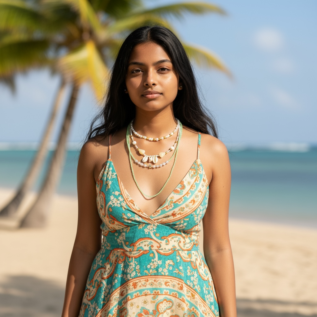 - A refreshing dual-layer necklace with sea shells, pearls, and mint-green beads.